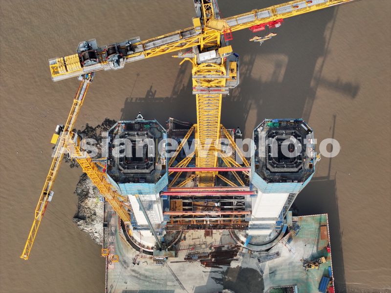 浙江舟山:双屿门特大桥索塔建设双双超百米 查看组图