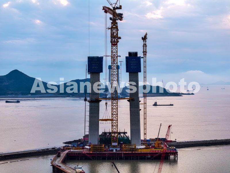 浙江舟山:双屿门特大桥索塔建设双双超百米 查看组图