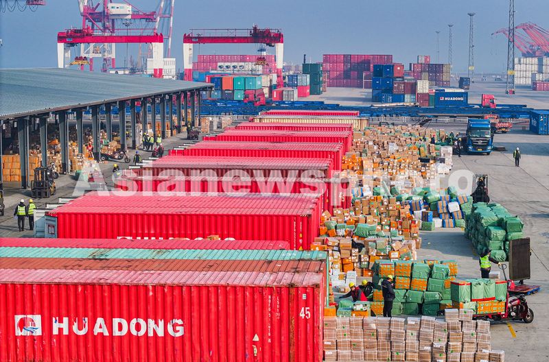 2025年1月5日,在山东省荣成市石岛管理区石岛新港口岸一处场站,工人在装卸货物。