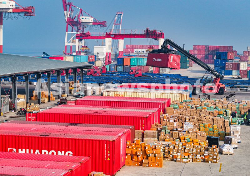 2025年1月5日,在山东省荣成市石岛管理区石岛新港口岸一处场站,工人在装卸货物。