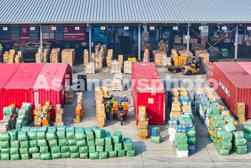 2025年1月5日,在山东省荣成市石岛管理区石岛新港口岸一处场站,工人在装卸货物。