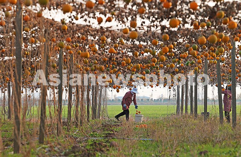 2025年1月5日,小寒节气到来,安徽省安庆市宿松县省属农垦华阳河农场,种植户在田间采摘瓜蒌。