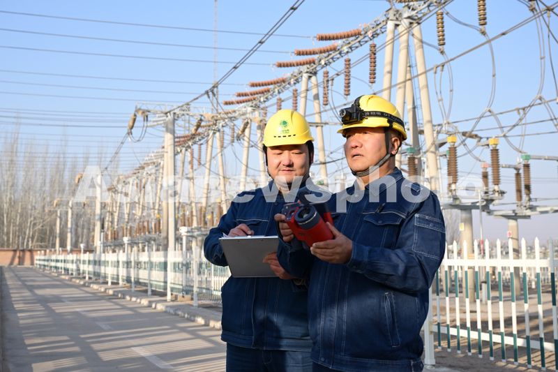 2025年1月1日,国网银川供电公司变电运维中心员工在宁夏银川芦花220千伏变电站开展“人机联合”巡检。