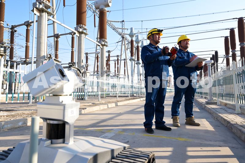 2025年1月1日,国网银川供电公司变电运维中心员工在宁夏银川芦花220千伏变电站开展“人机联合”巡检。