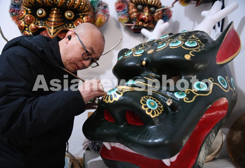 2025年1月7日,山西省运城市稷山县国家级非物质文化遗产高跷走兽的市级非遗传承人王维鹏正在彩绘高跷走兽的兽头。