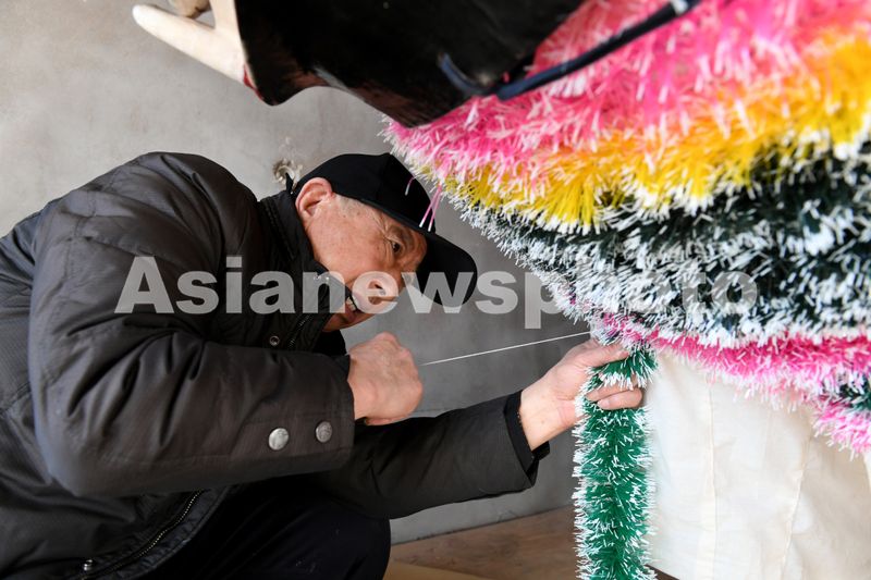 2025年1月7日,山西省运城市稷山县国家级非物质文化遗产高跷走兽的省级非遗传承人王成林正在制作高跷走兽。