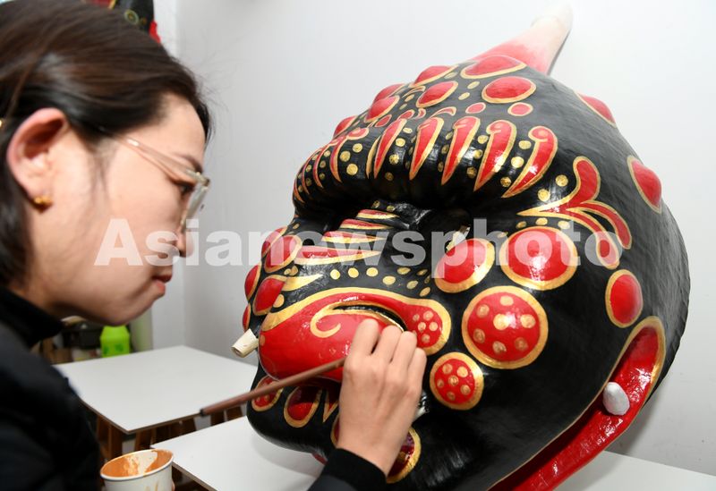 2025年1月7日,山西省运城市稷山县阳城高跷走兽保护中心的艺人正在彩绘高跷走兽的兽头。