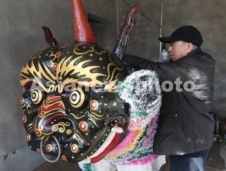 2025年1月7日,山西省运城市稷山县国家级非物质文化遗产高跷走兽的市级非遗传承人王维鹏正在彩绘高跷走兽的兽头。