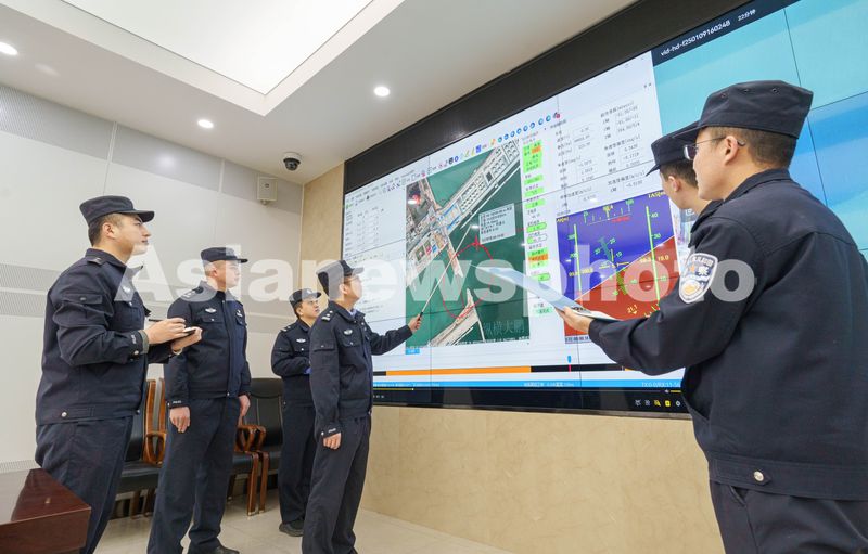 2025年1月10日,山东省东营市,民警研判无人机巡航采集信息。