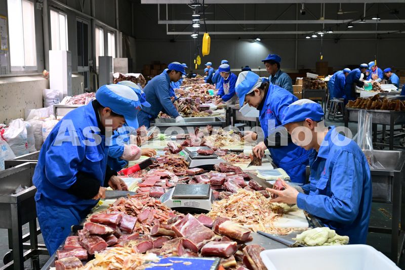 图片说明:2025年1月8日,在位于浙江省金华市浦江县的金华金贸火腿有限公司的生产车间里,工人们正忙着在修整、称重金华火腿,供应春节市场。