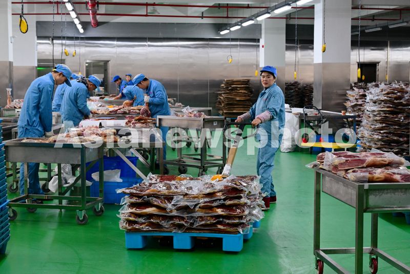 图片说明:2025年1月8日,在位于浙江省金华市浦江县的金华金贸火腿有限公司的生产车间里,工人们正忙着在修整、包装、搬运金华火腿,供应春节市场。