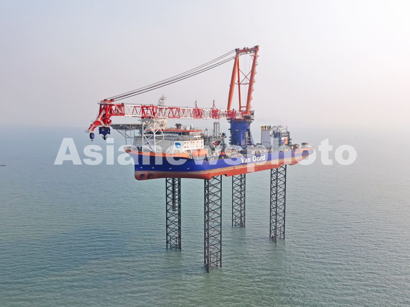 图片说明:2024年12月20日,BOREAS号海上风电安装船在山东烟台海域进行升降试验。