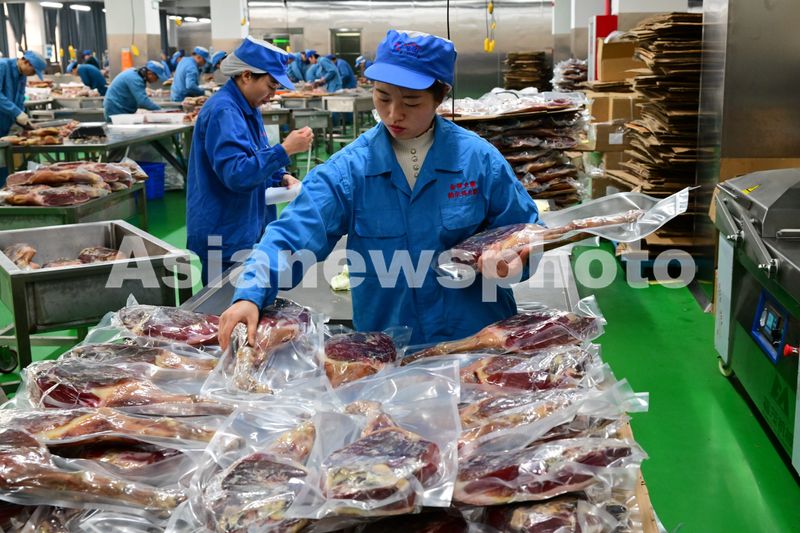 图片说明:2025年1月8日,在位于浙江省金华市浦江县的金华金贸火腿有限公司的生产车间里,工人们正忙着在修整、称重、包装金华火腿,供应春节市场。
