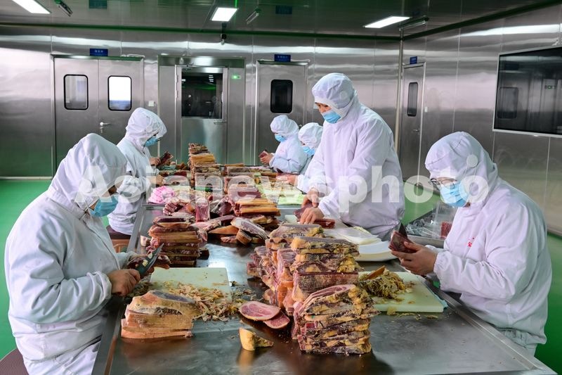图片说明:2025年1月8日,在位于浙江省金华市浦江县的金华金贸火腿有限公司的生产车间里,工人们正忙着在修整、包装金华火腿,供应春节市场。