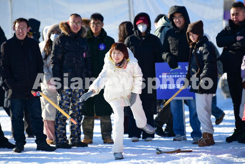图片说明:2025年1月10日,游客在城市冰雪那达慕上体验打布鲁。