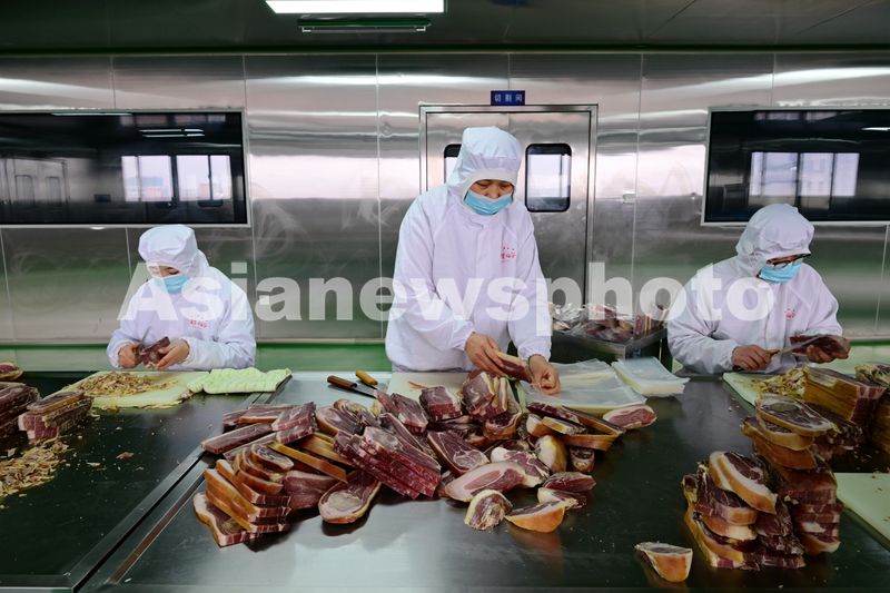 图片说明:2025年1月8日,在位于浙江省金华市浦江县的金华金贸火腿有限公司的生产车间里,工人们正忙着在修整、包装金华火腿,供应春节市场。