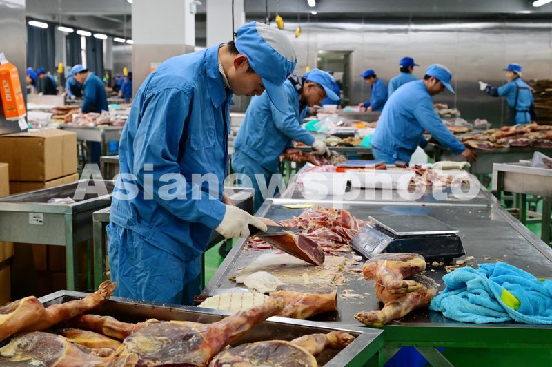 图片说明:2025年1月8日,在位于浙江省金华市浦江县的金华金贸火腿有限公司的生产车间里,工人们正忙着在修整、称重金华火腿,供应春节市场。