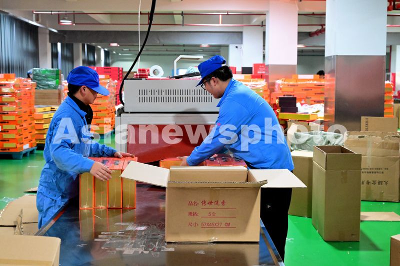 图片说明:2025年1月8日,在位于浙江省金华市浦江县的金华金贸火腿有限公司的生产车间里,工人们正忙着在包装金华火腿,供应春节市场。
