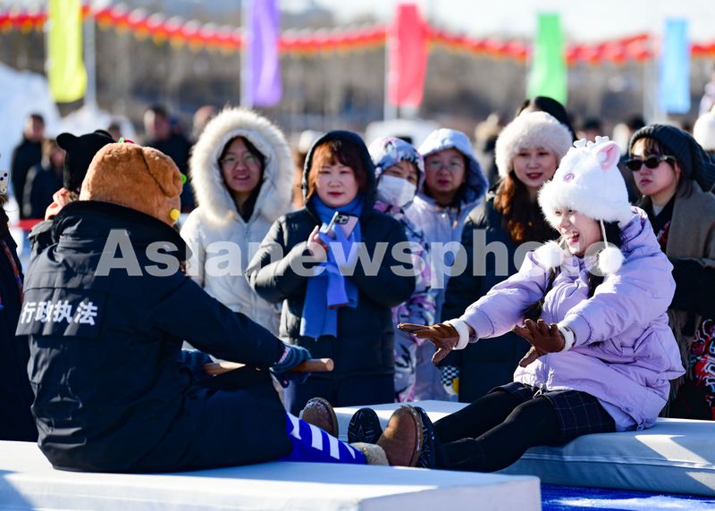 图片说明:2025年1月10日,游客在城市冰雪那达慕上体验扳棍。