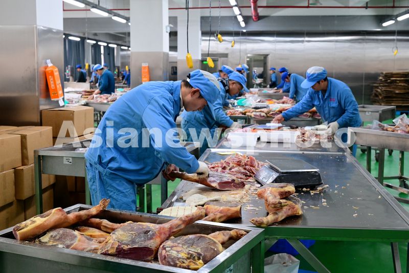 图片说明:2025年1月8日,在位于浙江省金华市浦江县的金华金贸火腿有限公司的生产车间里,工人们正忙着在修整、称重金华火腿,供应春节市场。
