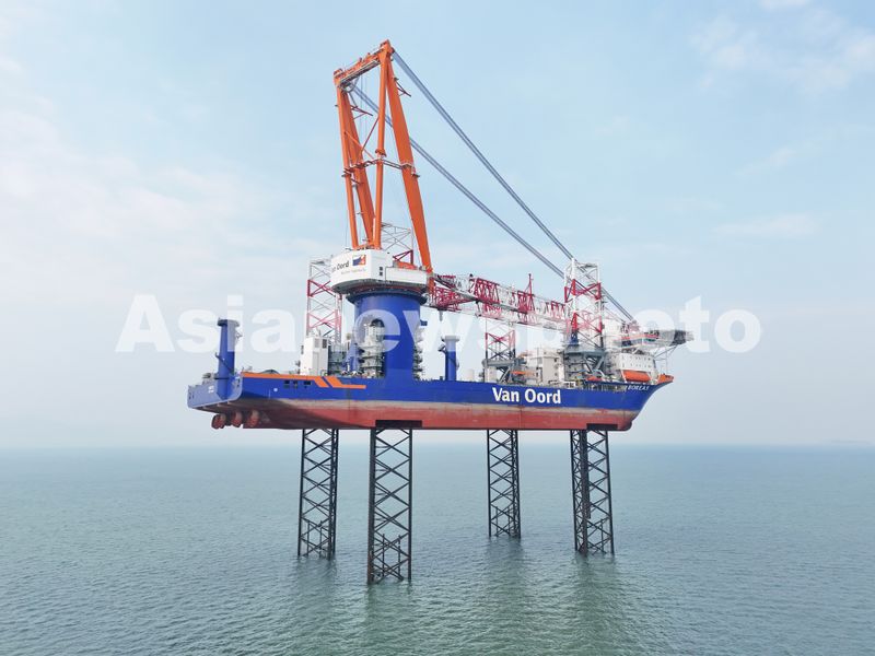 图片说明:2024年12月20日,BOREAS号海上风电安装船在山东烟台海域进行升降试验。