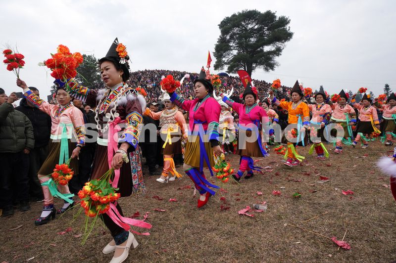 1月10日, 在广西融水苗族自治县良寨乡国里苗寨,苗族女子党横坡会上跳踩堂舞。