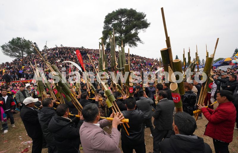 1月10日, 在广西融水苗族自治县良寨乡国里苗寨,苗家汉子在党横坡会上吹奏芦笙。