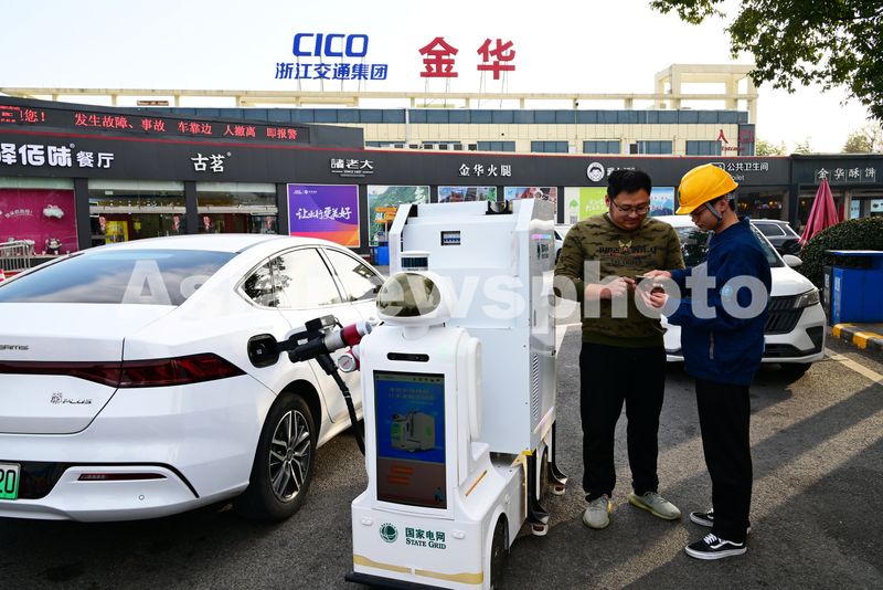 图片说明:2025年1月14日,浙江金华,春运首日,在沪昆高速金华服务区,一台智能充电机器人正在给过往的新能源汽车充电。