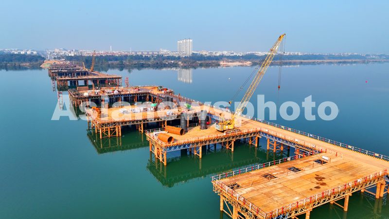 图片说明:2025年1月14日,江西省吉安市吉水赣江大桥项目施工现场吊臂林立、机械轰鸣,工人在有序推进大桥桩基施工。