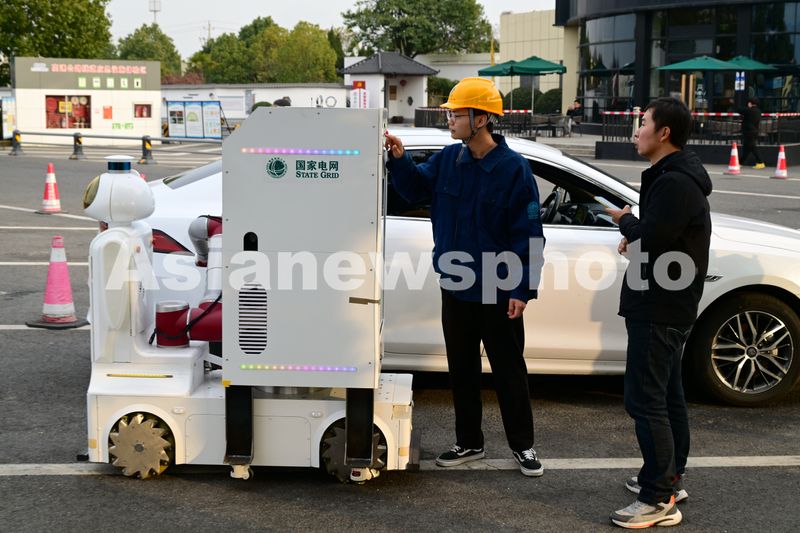 图片说明:2025年1月14日,浙江金华,春运首日,在沪昆高速金华服务区,一台智能充电机器人正在给过往的新能源汽车充电。
