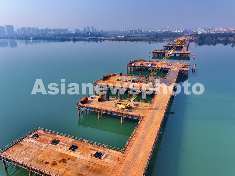 图片说明:2025年1月14日,江西省吉安市吉水赣江大桥项目施工现场吊臂林立、机械轰鸣,工人在有序推进大桥桩基施工。