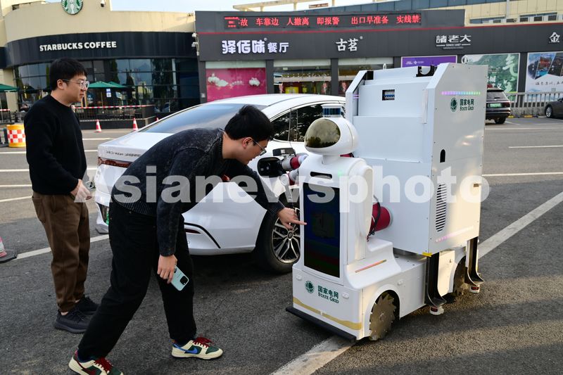 图片说明:2025年1月14日,浙江金华,春运首日,在沪昆高速金华服务区,一台智能充电机器人正在给新能源汽车充电,吸引过往司乘人员围观。