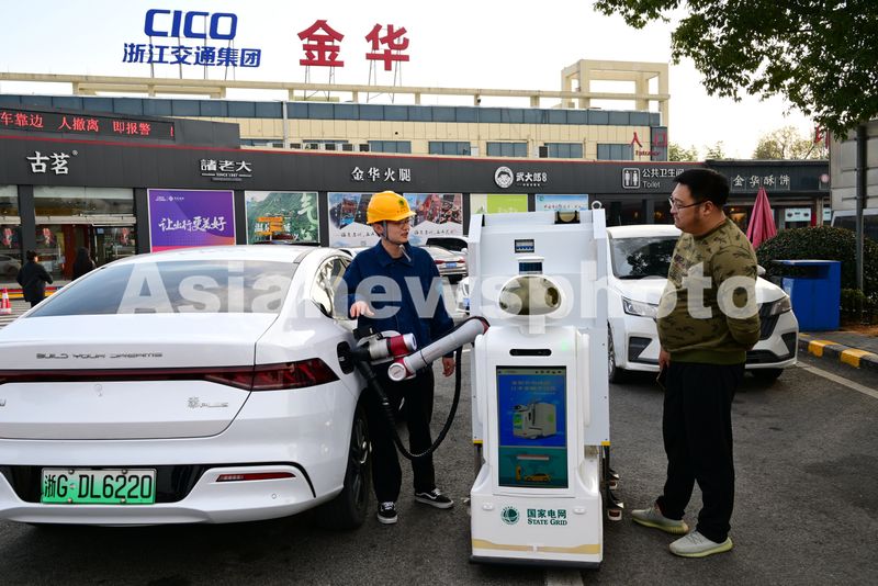 图片说明:2025年1月14日,浙江金华,春运首日,在沪昆高速金华服务区,一台智能充电机器人正在给过往的新能源汽车充电。