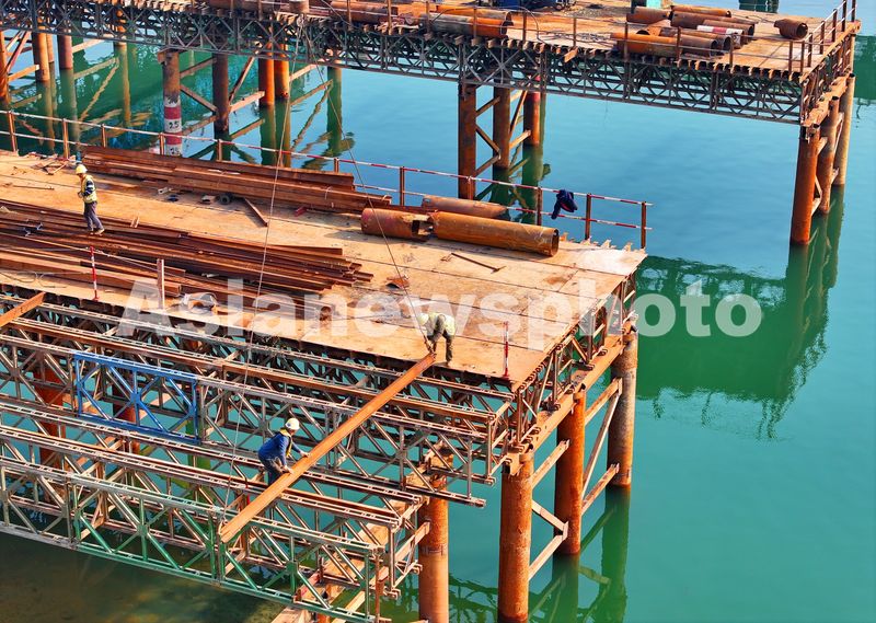 图片说明:2025年1月14日,江西省吉安市吉水赣江大桥项目施工现场吊臂林立、机械轰鸣,工人在有序推进大桥桩基施工。