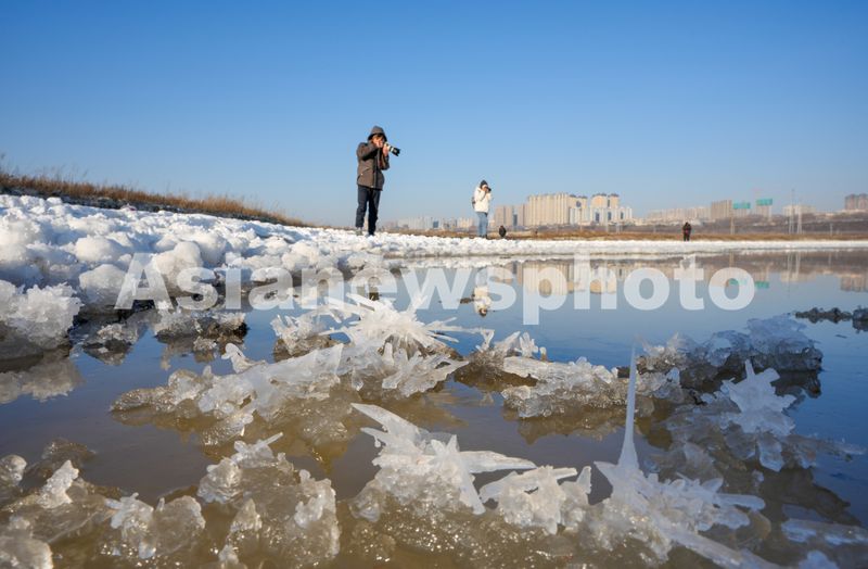 图片说明:2025年1月16日,摄影爱好者在山西省运城盐湖拍摄“硝花”景观。