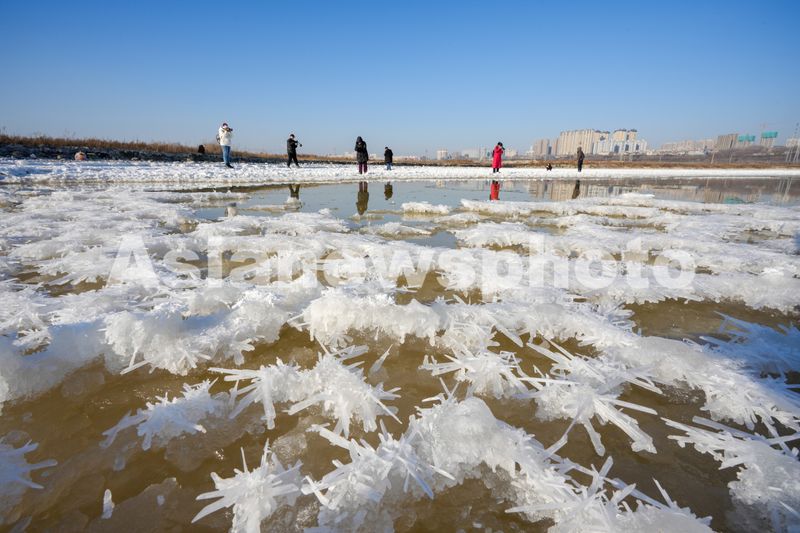 图片说明:2025年1月16日,摄影爱好者在山西省运城盐湖拍摄“硝花”景观。