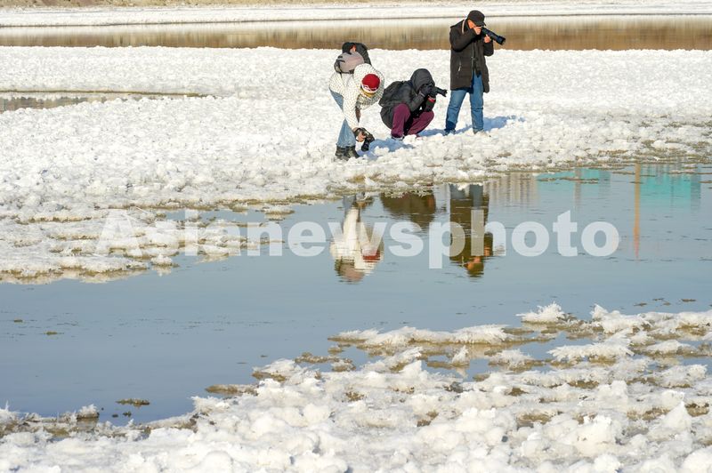 图片说明:2025年1月16日,摄影爱好者在山西省运城盐湖拍摄“硝花”景观。
