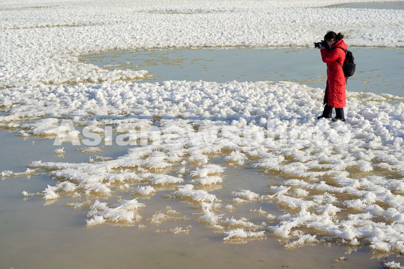 图片说明:2025年1月16日,摄影爱好者在山西省运城盐湖拍摄“硝花”景观。