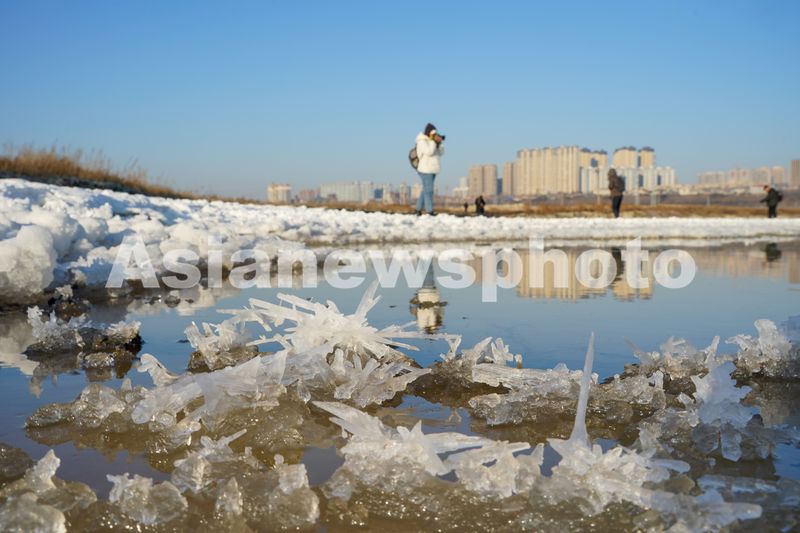 图片说明:2025年1月16日,摄影爱好者在山西省运城盐湖拍摄“硝花”景观。