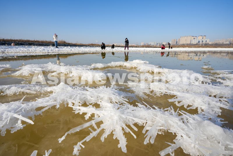 图片说明:2025年1月16日,摄影爱好者在山西省运城盐湖拍摄“硝花”景观。