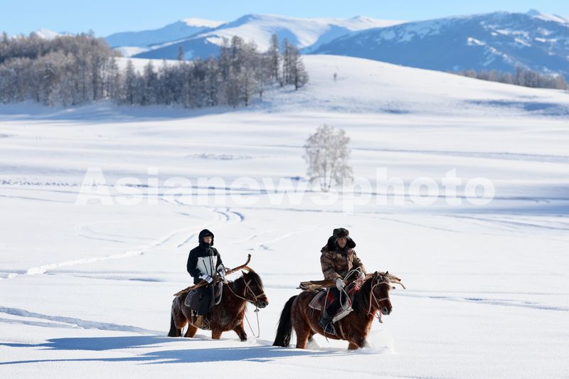 2025年1月15日,阿扎玛提·阿达力别克(左)与爸爸阿达力别克·哈塄别克携带着毛皮滑雪板骑马出行。