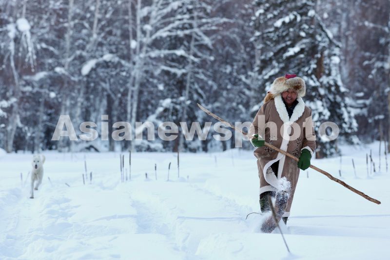 2025年1月15日,阿扎玛提·阿达力别克的大伯米力别克·哈塄别克使用自己亲手制作的毛皮滑雪板在树林中行走。