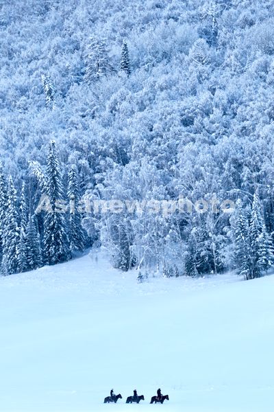 2025年1月15日,阿扎玛提·阿达力别克(左)与妈妈巴提玛·毛唔肯(中)爸爸阿达力别克·哈塄别克一同骑马出行。