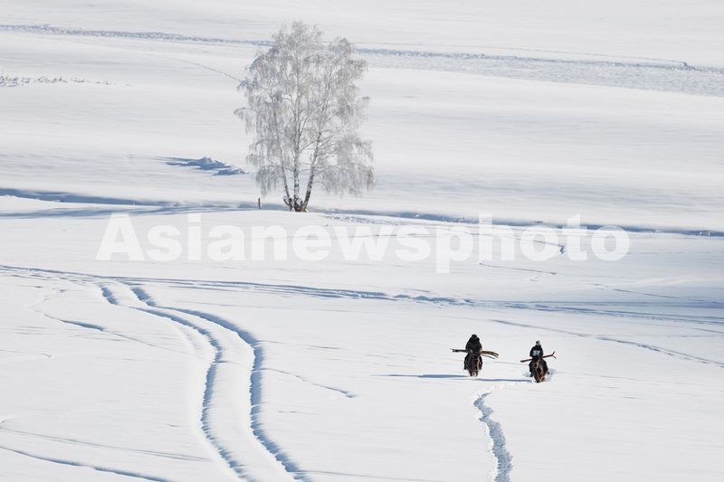2025年1月15日,阿扎玛提·阿达力别克(右)与爸爸阿达力别克·哈塄别克携带着毛皮滑雪板骑马出行。