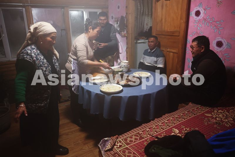 2025年1月14日,阿扎玛提的妈妈巴提玛·毛唔肯(左二)为一家人准备晚餐。