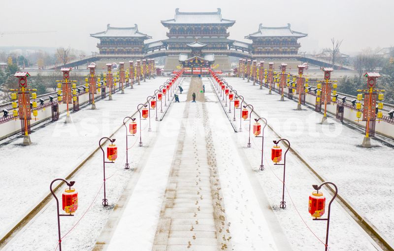 2025年1月24日,航拍雪中的河南省洛阳市隋唐洛阳城九洲池景区。