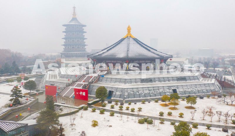 2025年1月24日,航拍雪中的河南省洛阳市隋唐洛阳城天堂明堂景区。