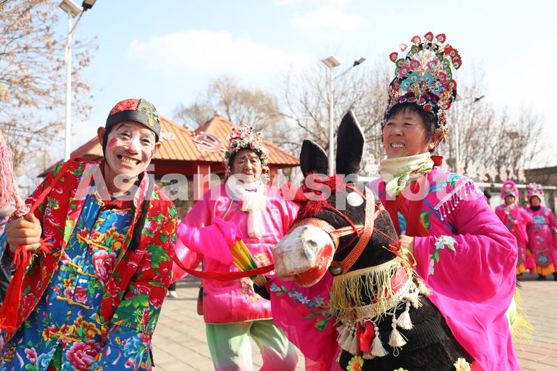2025年2月2日,在河北省唐山市丰润区泉河头镇亢各庄村,民间艺人在表演扭秧歌,通过传统秧歌表演庆祝春节。