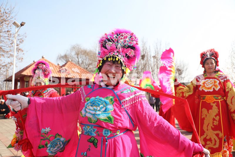 2025年2月2日,在河北省唐山市丰润区泉河头镇亢各庄村,民间艺人在表演扭秧歌。