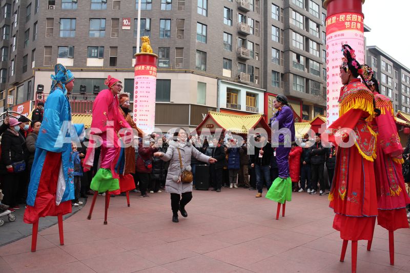 2025年2月2日农历乙巳年春节正月初五,正在陕西省西安市民乐园步行街表演非遗高跷的演员主动邀请观众一起随着欢快的鼓点节奏互动同乐。